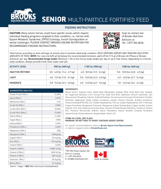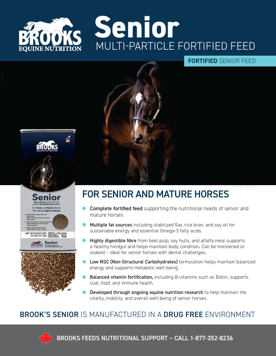 Brooks Senior est une formule spécialement conçue pour répondre aux besoins nutritionnels des chevaux âgés.