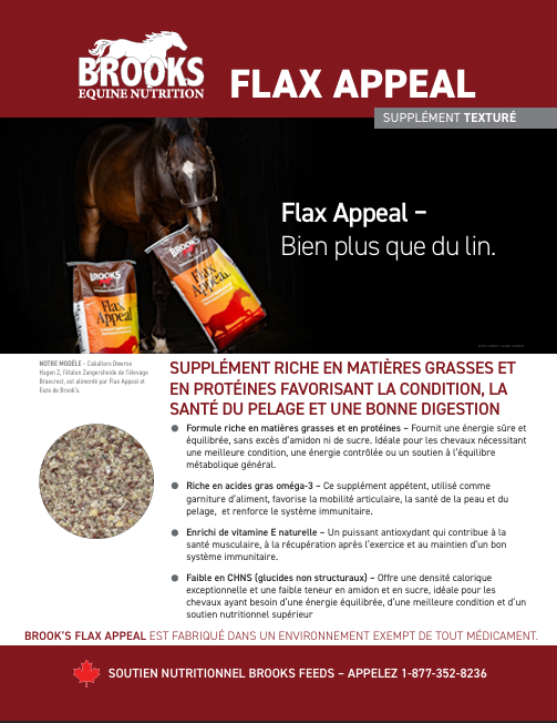 Très faible en amidon et en sucre, Flax Appeal offre une alternative énergétique adaptée aux chevaux sensibles aux céréales, tout en soutenant la récupération et la vitalité.